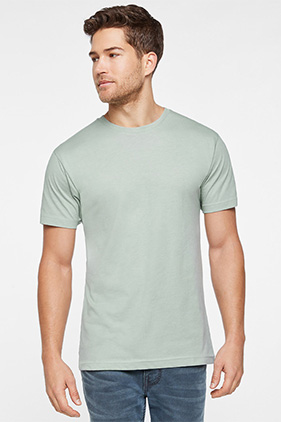 4.5 oz. (g), 60/40 algodón orgánico peinado e hilado en anillo / poliéster reciclado posconsumo, tejido jersey fino.